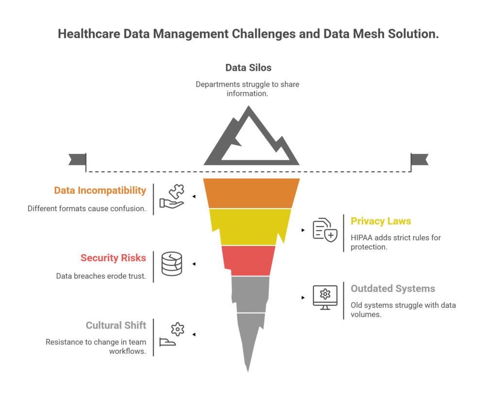 For example, a hospital might struggle to combine patient records from different departments to create a full picture of a patient’s health. This leads to delays in treatment or missed opportunities for research. The complexity of healthcare data, combined with old habits and systems, creates a bottleneck that data mesh aims to fix.