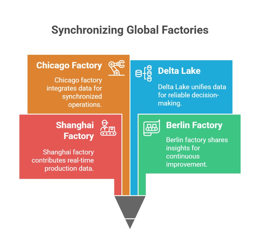 Imagine your factories in Shanghai, Berlin, and Chicago functioning as a single, synchronized machine. Production data flows seamlessly, enabling each plant to learn from the others in real time. Delta Lake makes this possible by consolidating data from diverse regions into a single, reliable source of truth.