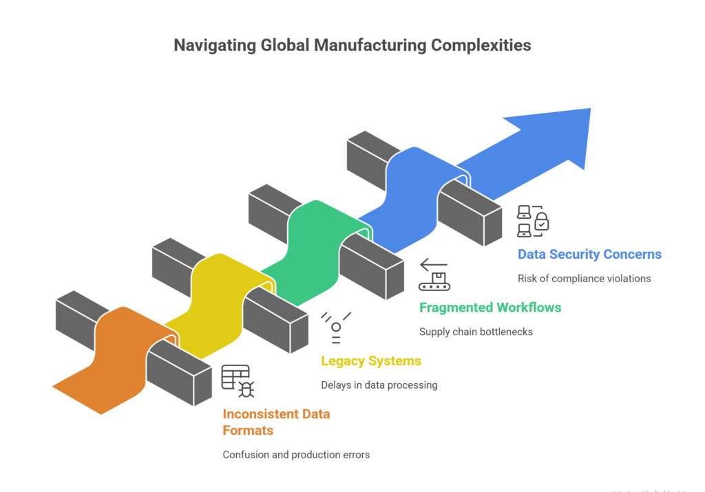 Operating across multiple regions presents unique hurdles. Factories often rely on inconsistent data formats, legacy systems, and fragmented workflows, leading to confusion and delays. Data security concerns, especially when sharing across borders, add complexity. These challenges result in production errors, supply chain bottlenecks, and missed market opportunities.
